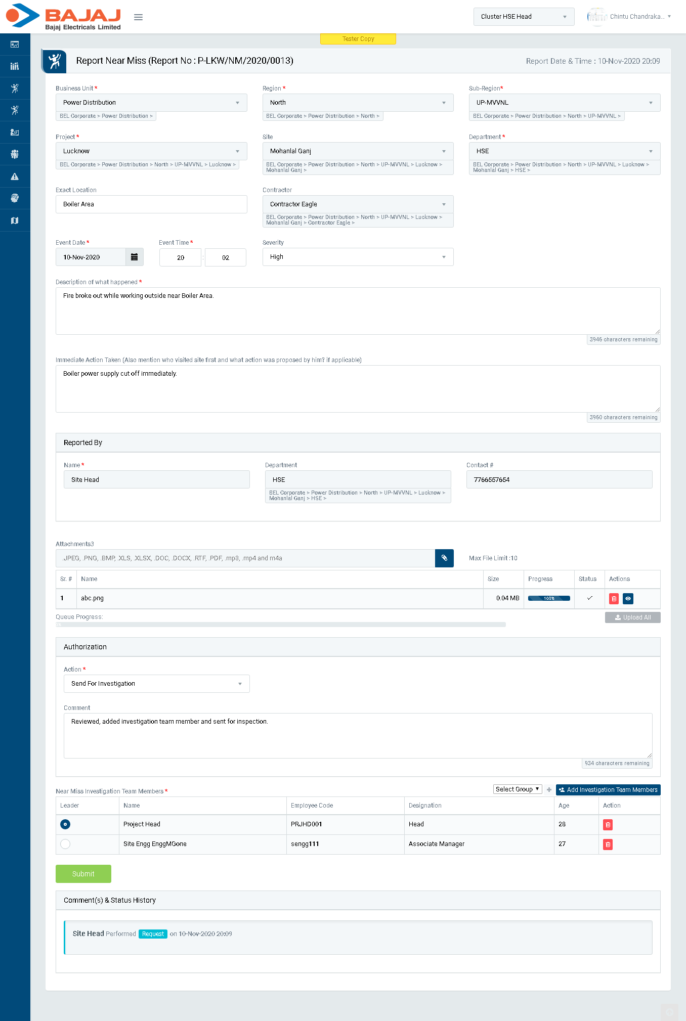 button is clicked. The group is predefined where number of users are added to create a group. - Click Submit button to save the details and send the near miss report for investigation to investigation team members.