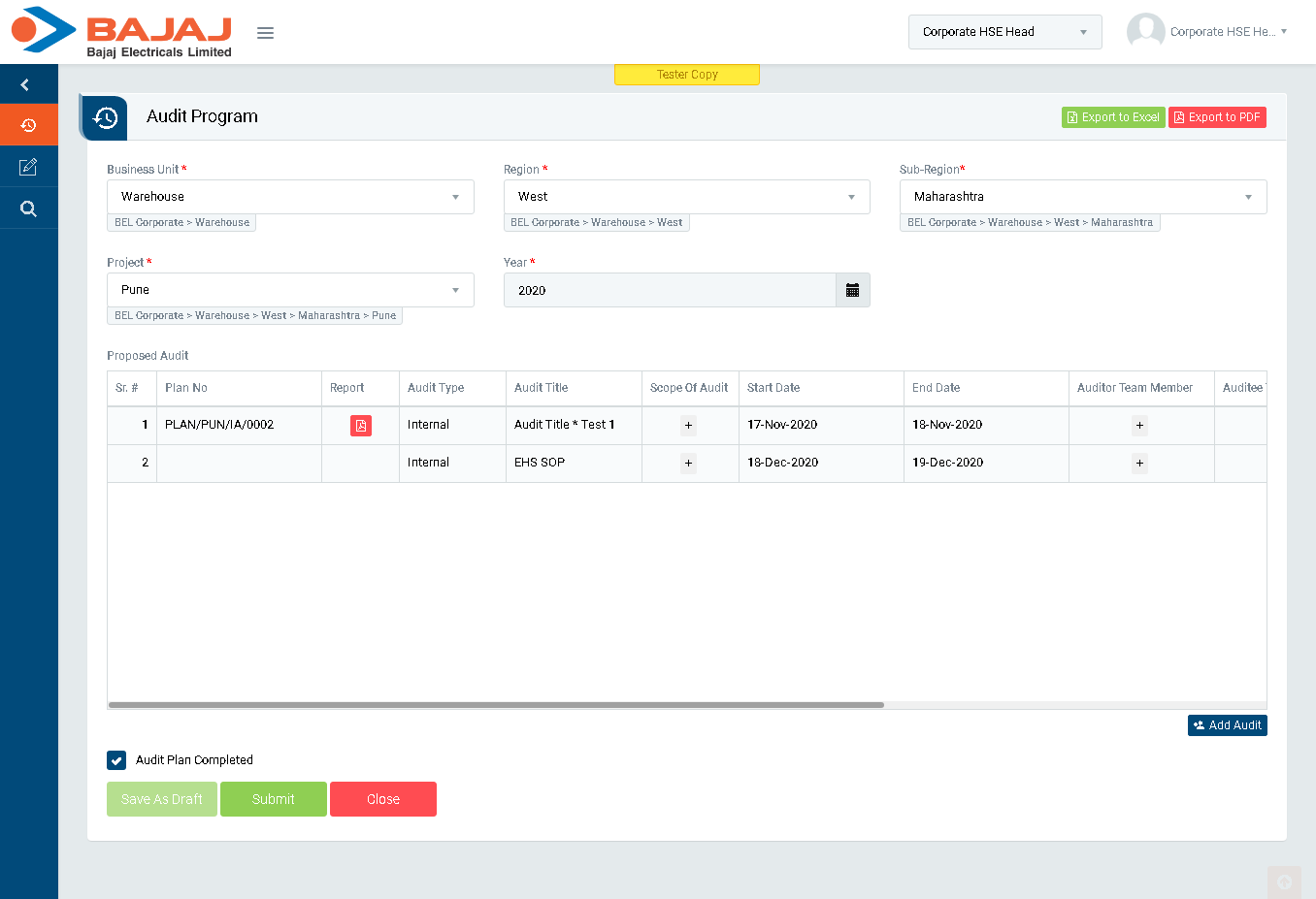 - Select “Audit Plan Completed” and click “Submit” button to save and schedule plan. Once plan is saved the audit details will be displayed to respective Auditor.