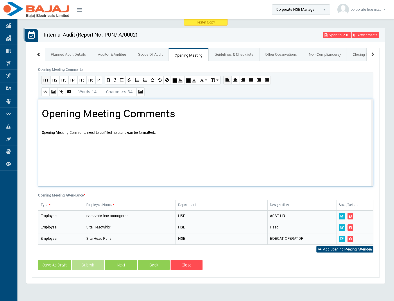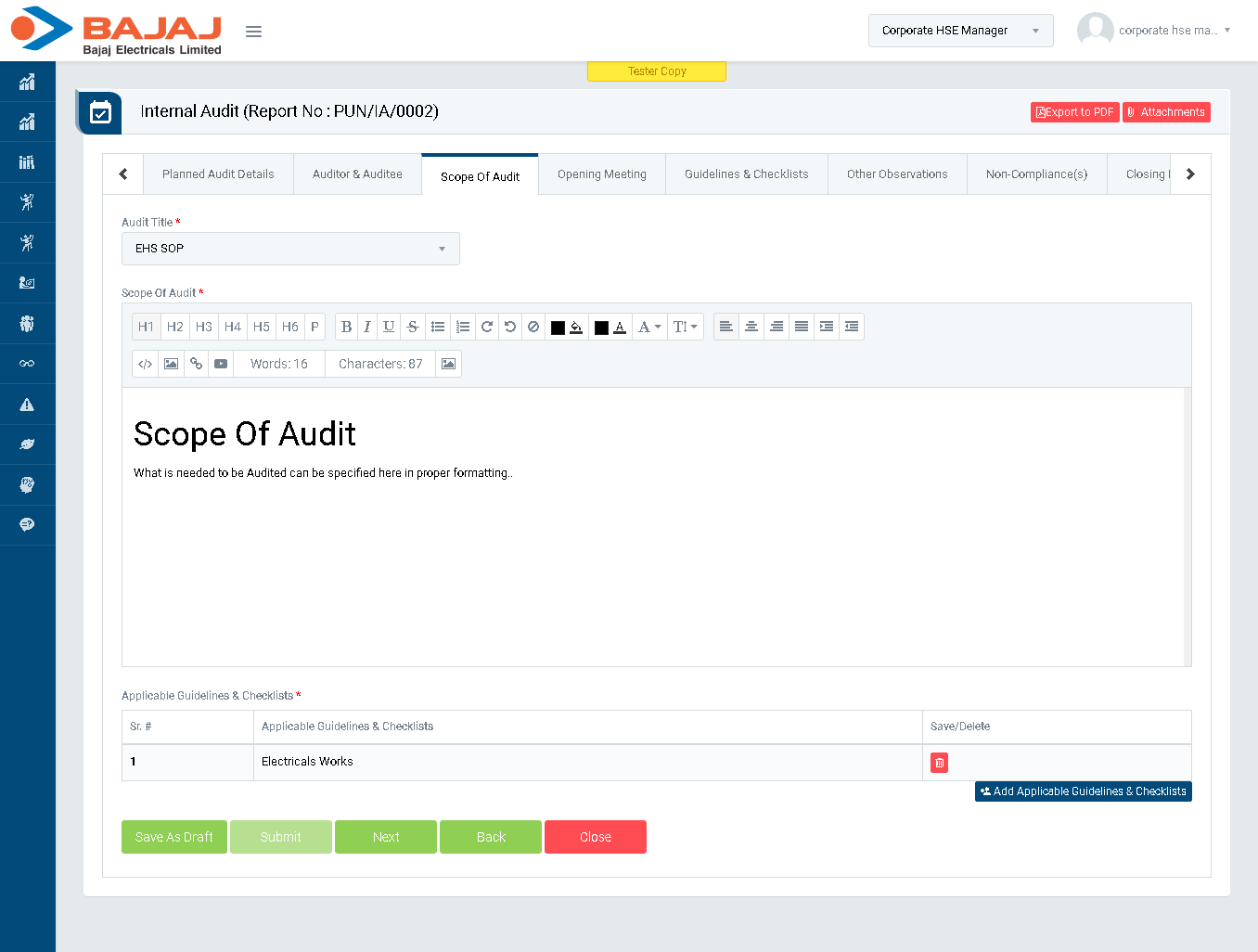 - In “Scope Of Audit” section enter Scope Of Audit and click “Next” button to go to “Opening Meeting Comments” section.(Image 5E)