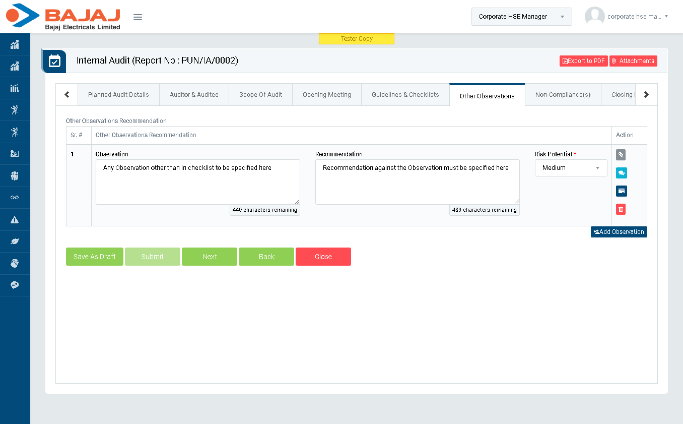- In “Other Observations” section enter Other Observations and click “Next” button to go to “Non-Compliance(s)” section.(Image 5H)
