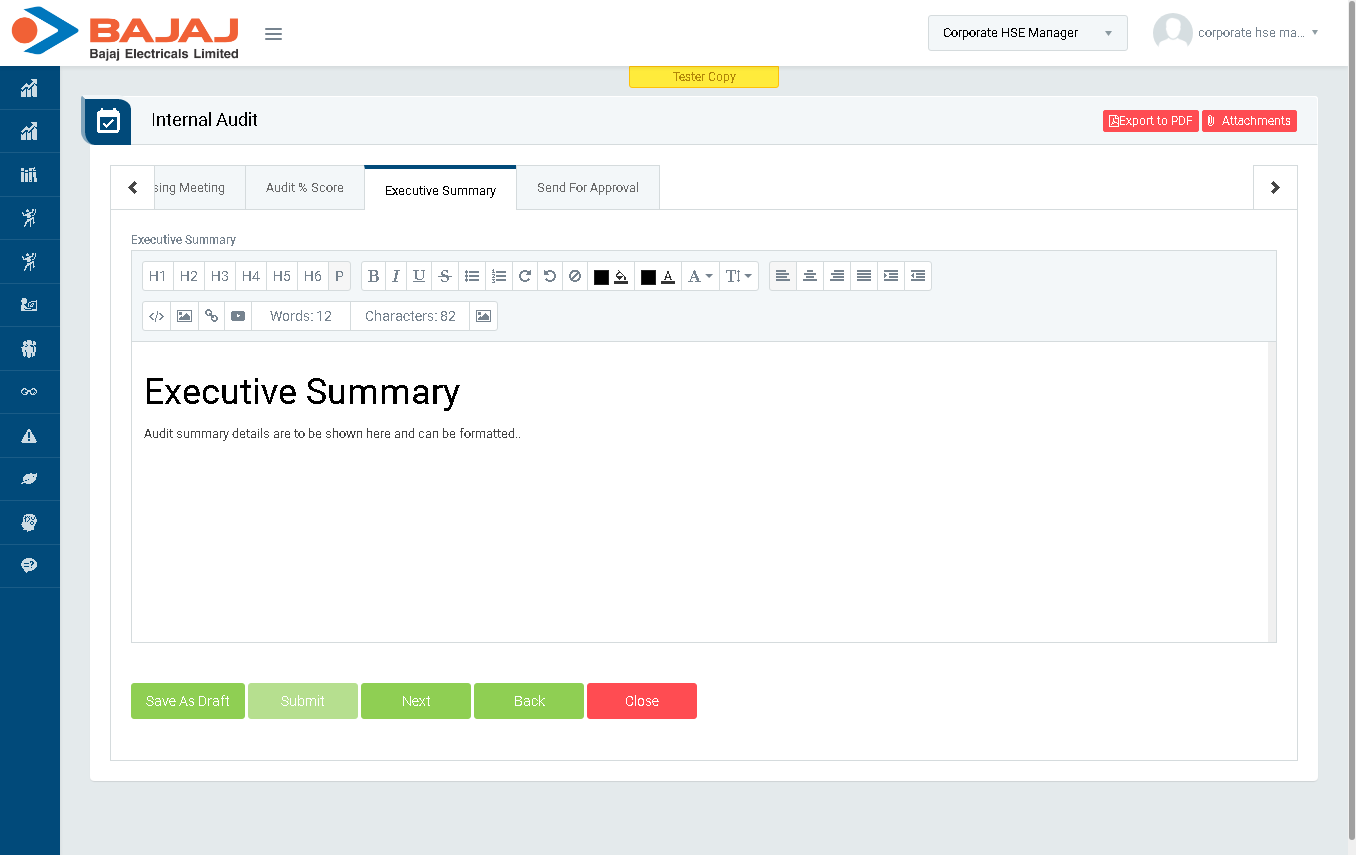 - In “Executive Summary” section enter audit summary details and click “Next” button to go to “Send For Approval” section.(Image 5L)