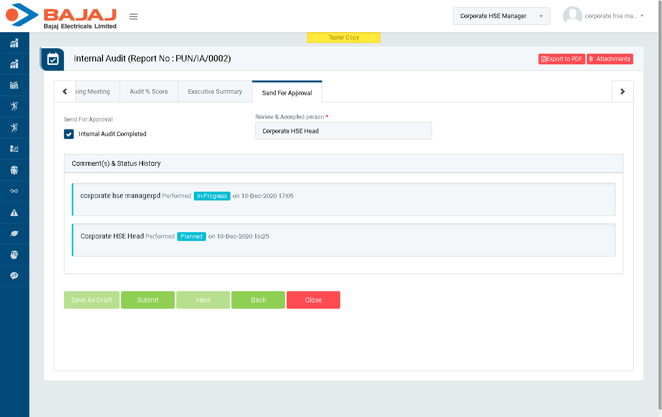 - In “Send For Approval” section, select “Internal Audit Completed” check box and click Submit button to Close the audit.