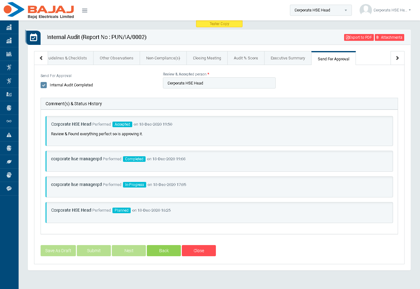 - Send back for correction : If Send back for correction is selected then the audit report will be rejected & go back to auditor for re-submit & the comment is mandatory to enter then.