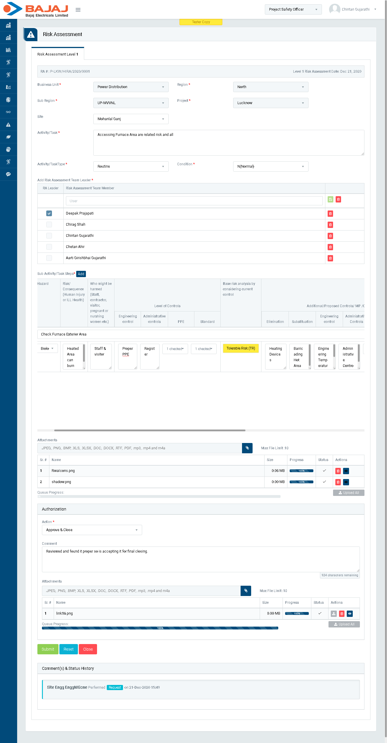 - Also, if “Base risk analysis by considering current control” selected as Significant Risk or Intolerable Risk then, the Risk Assessment will further be sent to Cluster HSE Head for Approval (Same as here in Project Safety Officer).